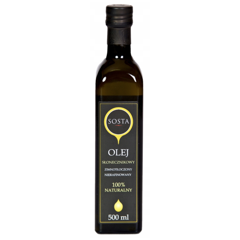 Olej słonecznikowy tłoczony na zimno, nierafinowany przewyższa jakością te, powszechnie dostępne w sklepach, niestety, w procesie produkcji podgrzewane są one do wysokich temperatur, tracąc przy tym większość swoich drogocennych właściwości, w tym aromat i oczywiście smak. Dzięki tłoczeniu na zimno, olej słonecznikowy Sosta zachowuje wszystkie właściwości nasion słonecznika.